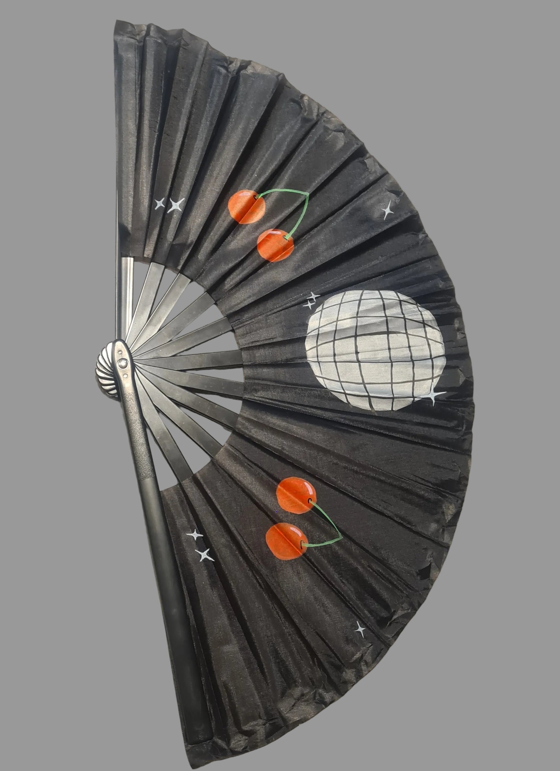 These Cherries and Discoball Rave Fans are a bold, handpainted festival essential featuring the popular shining silver discoballs with bright......